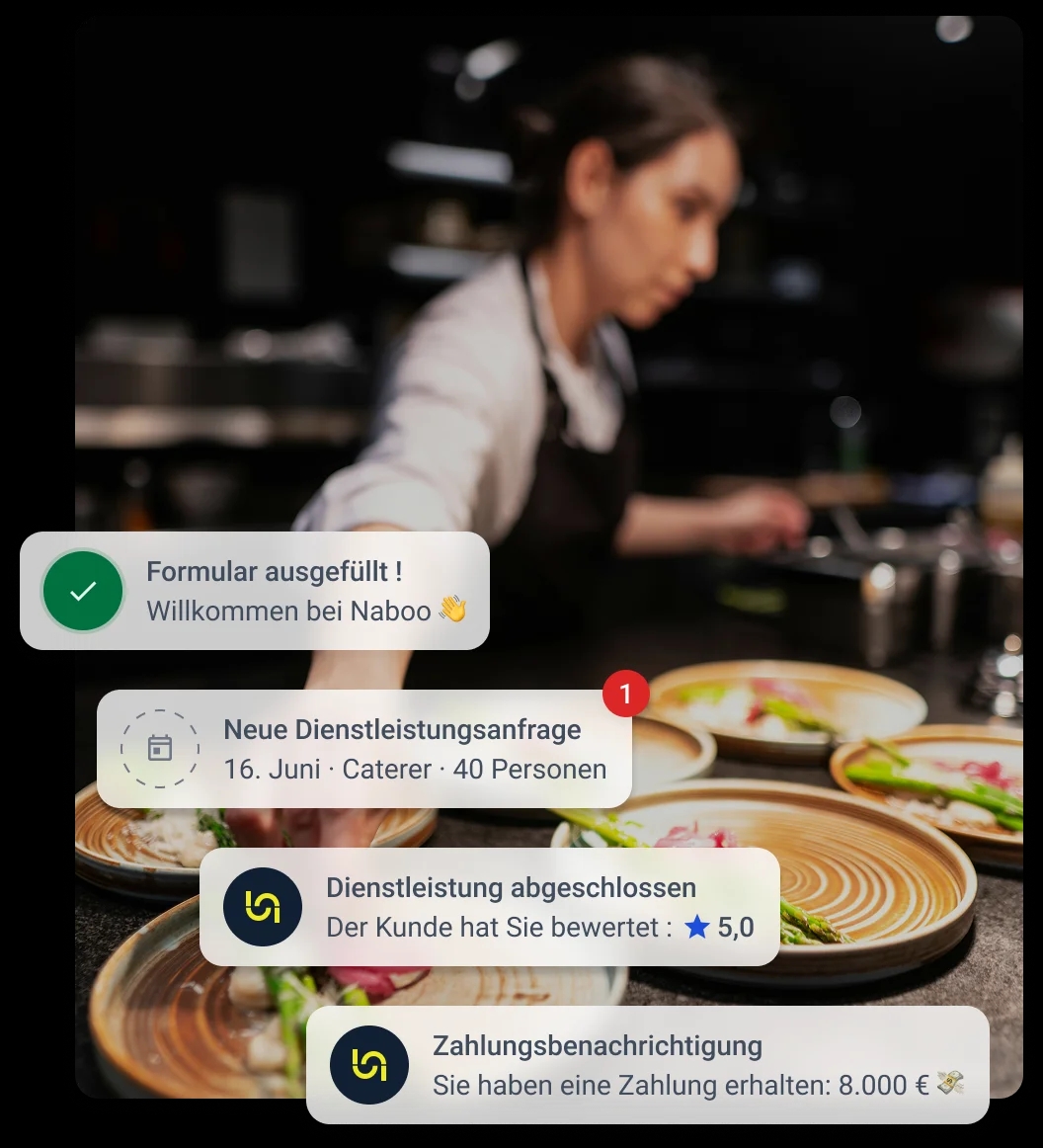 Sie sind im Eventbereich tätig und möchten Ihr Geschäft ausbauen? Werden Sie Teil von Naboo und gewinnen Sie Sichtbarkeit bei über 5.000 Kundenunternehmen in ganz Europa.